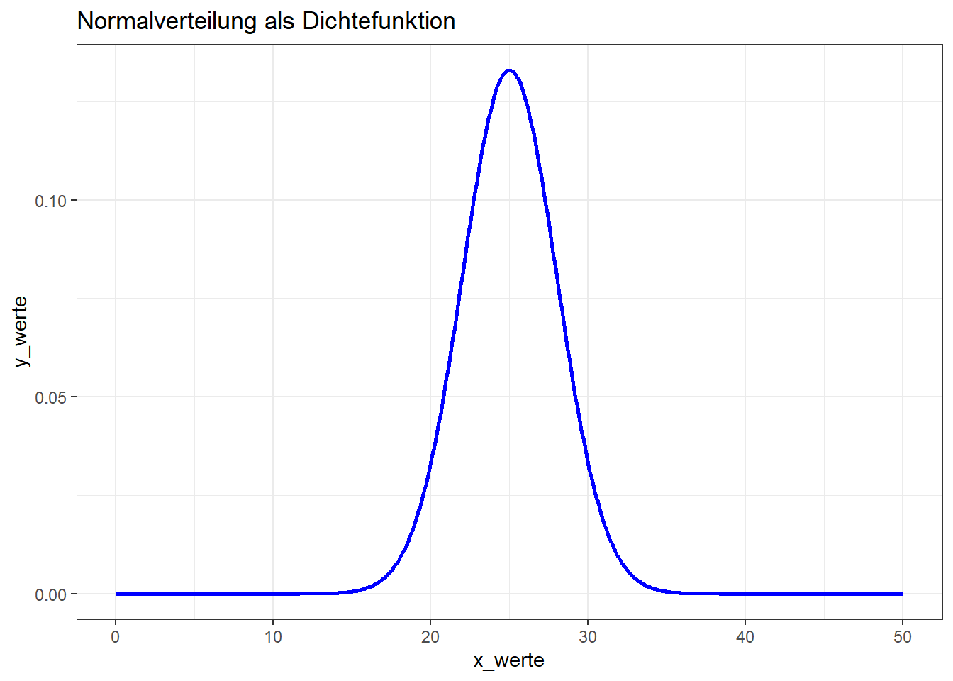 y_werte <- dnorm(x_werte, mw, sd)Nun haben wir die Werte. Zur Überprüfung, ob es sich wirklich um eine Normalverteilung mit den Parametern handelt, können wir sie als Histogramm darstellen. Da die simulierten Werte ja einer theoretischen Normalverteilung entsprechen, müssen wir in der uns bereits bekannten Funktion geom_histogram im Paket ggplot2 definieren, dass der Plot als sog. Dichtefunktion dargestellt wird. Dies tun wir mittels der Spezifizierung afterstat(density) in den aesthetics. Für das Beispiel hier, plotten wir lediglich das Liniendiagram: